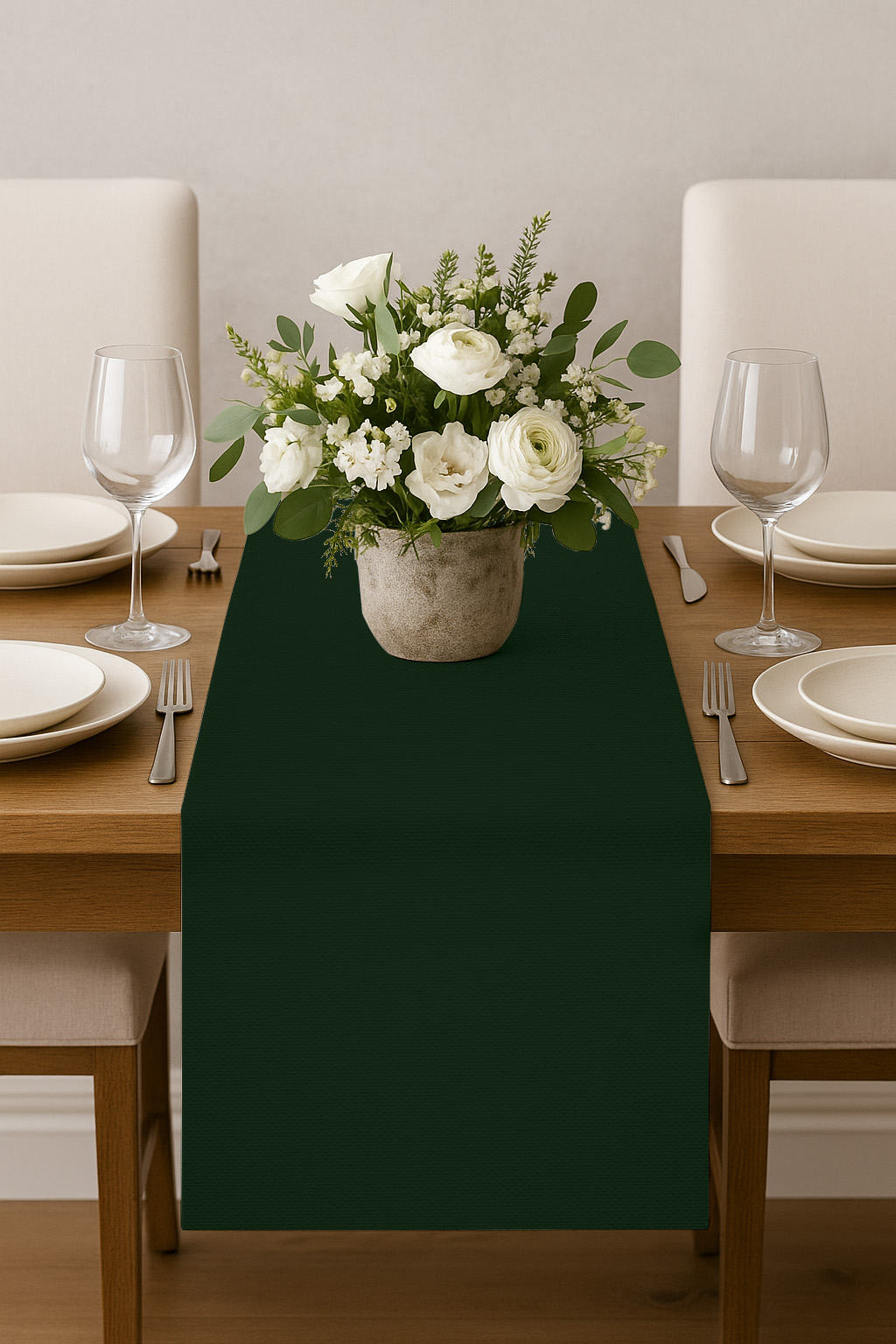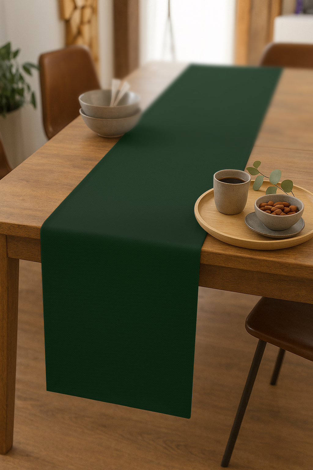 - Stylowy bieżnik w kolorze butelkowej zieleni – elegancki wybór do klasycznych i świątecznych dekoracji stołu.