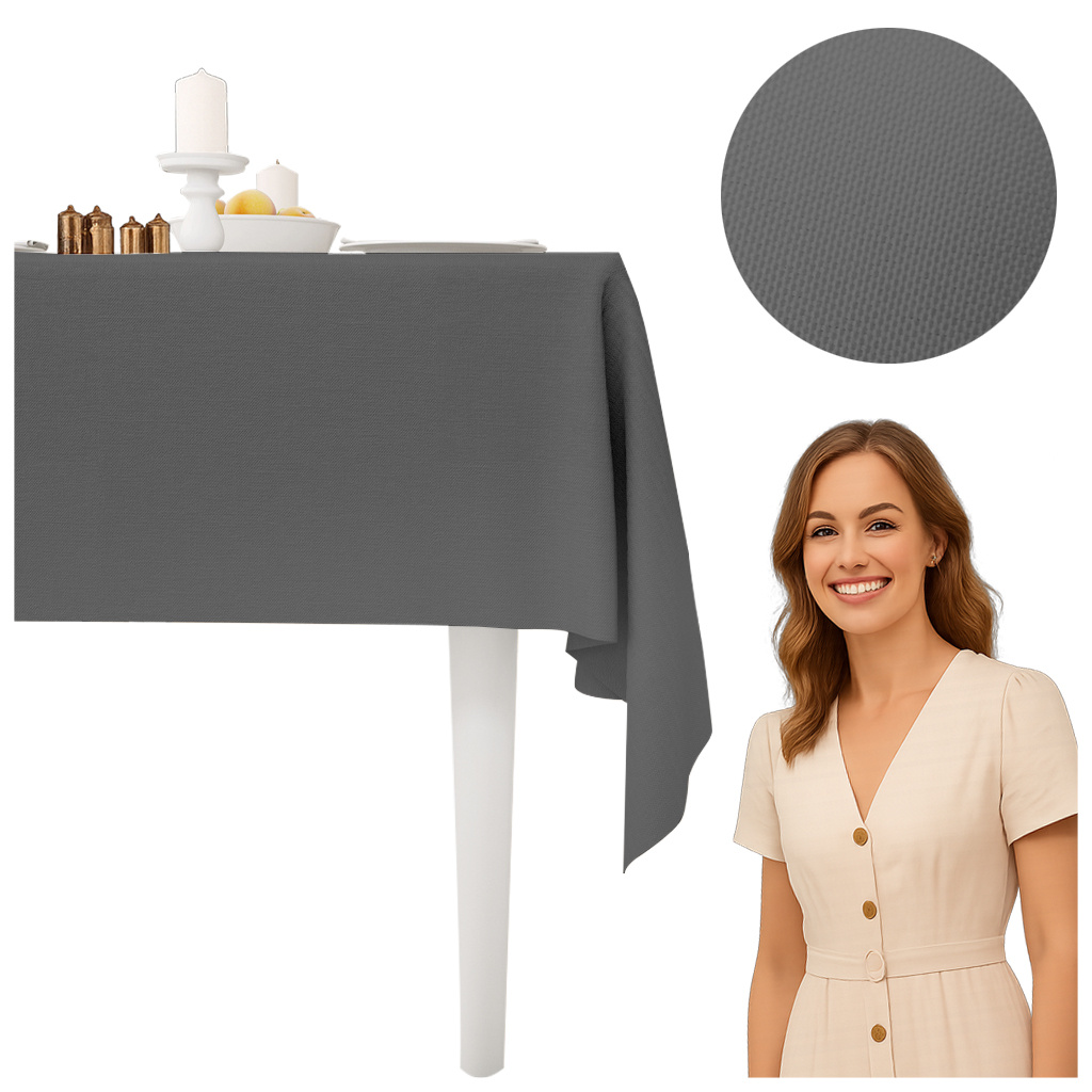 - Obrus na stół o wymiarach 140x240 cm w kolorze ciemnym szarym.