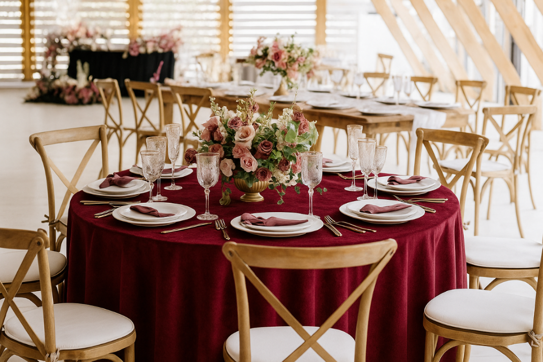 Nasze obrusy mają delikatny, kolor bordowy i matową welurową strukturę, stanowią gustowne tło dla szkła, filiżanek oraz sztućców.
