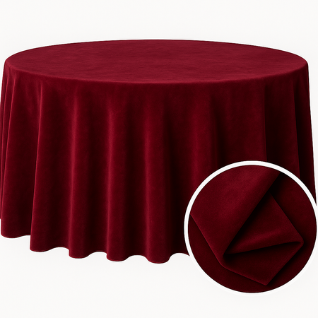 - Okrągły obrus z matowego weluru o średnicy 320 cm w kolorze bordowym. Efektowna oprawa dużego stołu na wyjątkowe okazje.