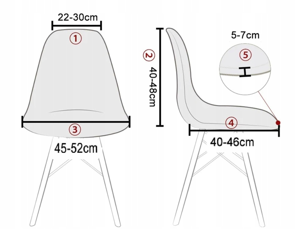 Nie musisz martwić się kształtem oparcia- nasze pokrowce pasują na wszystkie krzesła, których wymiary zgodne są z zamieszczonymi poniżej;