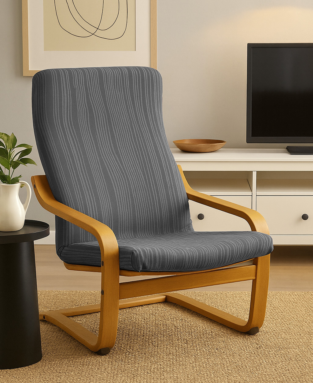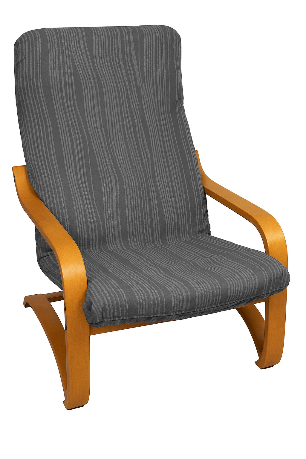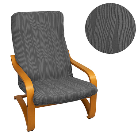 - Pokrowiec na fotel Finka w kolorze ciemnoszarym, wykonany z żakardowej tkaniny strukturalnej z wypukłym wzorem w pasy. Chroni mebel i nadaje mu elegancki, nowoczesny wygląd.
