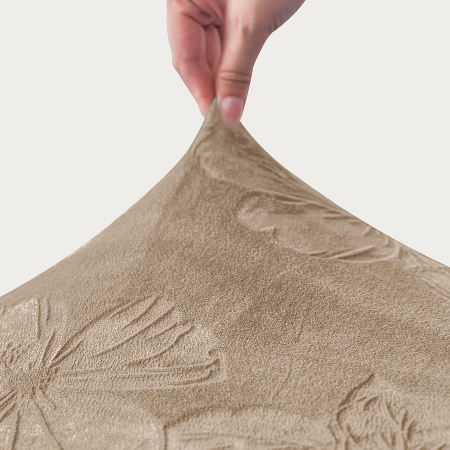 Pokrowiec uszyty jest z miękkiego weluru z wytłaczanym wzorem kwiatów hibiskusa. Dzięki domieszce elastanu materiał idealnie dopasowuje się do fotela i wraca do pierwotnego kształtu.