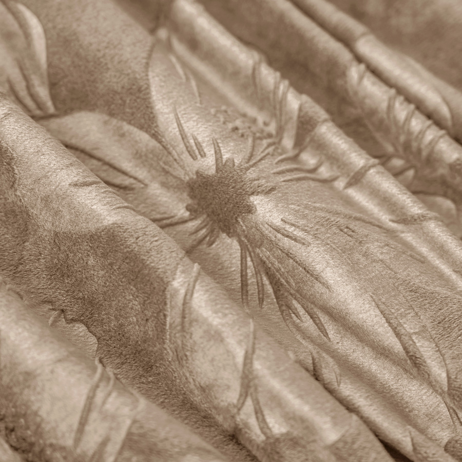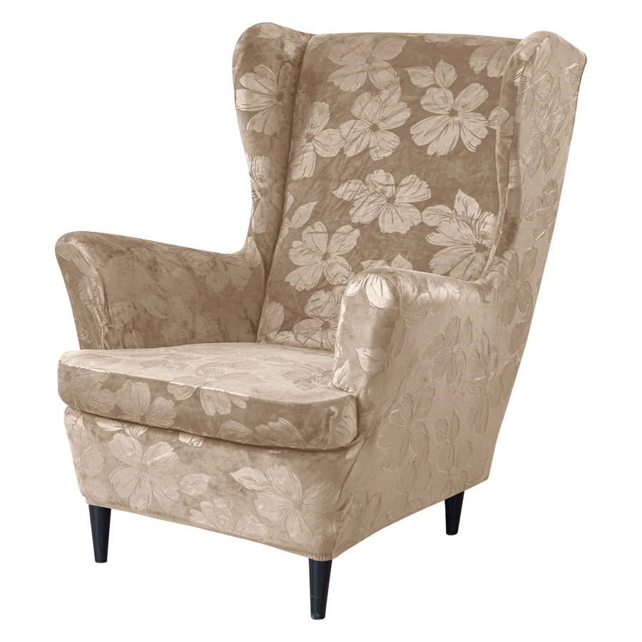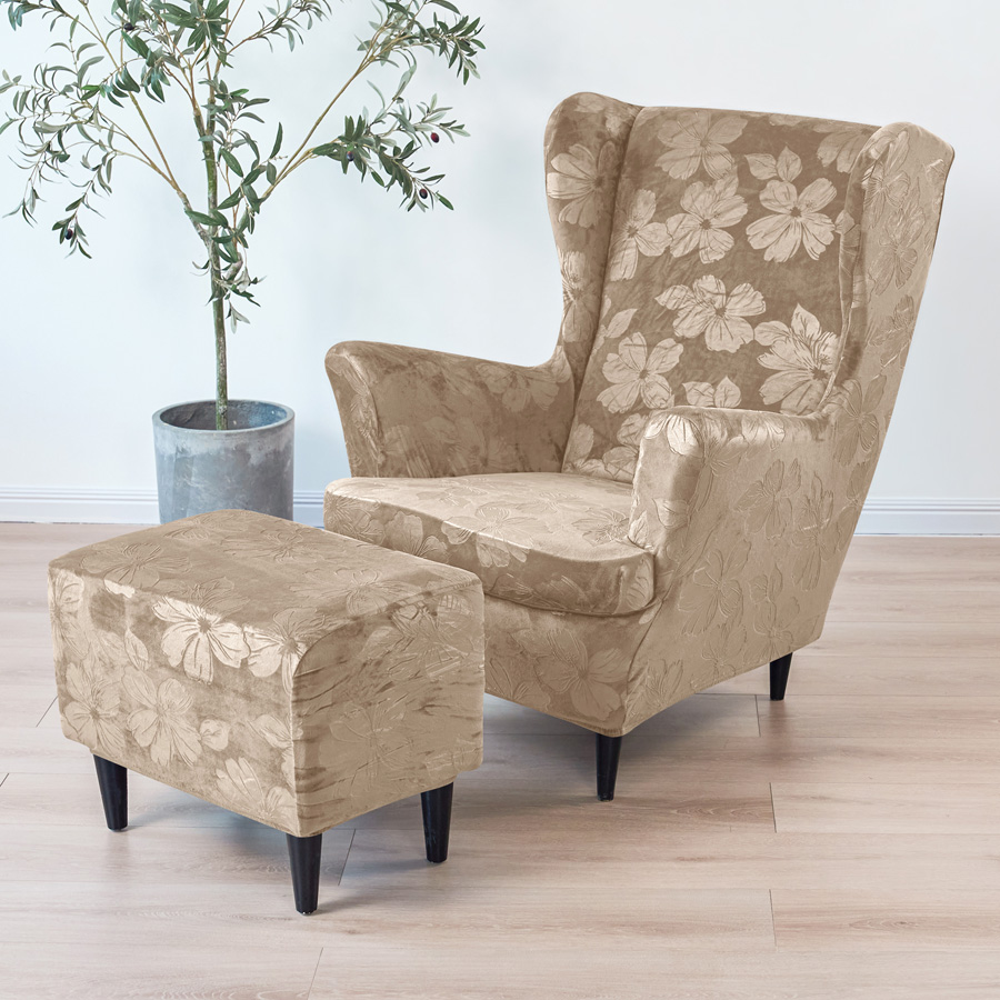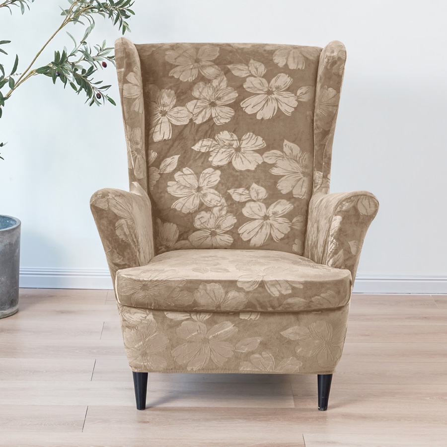 - Welurowy pokrowiec na fotel Uszak z eleganckim, wytłaczanym wzorem kwiatów hibiskusa w kolorze beżowym. Miękki, przyjemny w dotyku materiał nada wnętrzu subtelnej elegancji i skutecznie ochroni fotel przed zabrudzeniami.