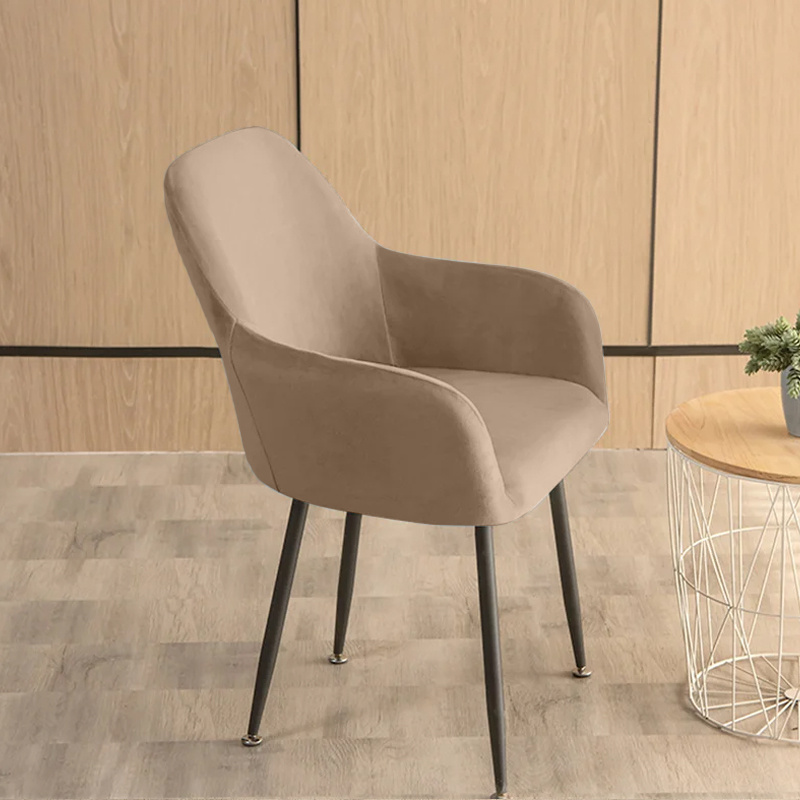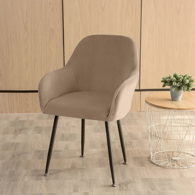 - Pokrowiec na krzesło kubełkowe z podłokietnikami, wykonany z miękkiego weluru w kolorze beżowym. Model Apple Sevilla nadaje wnętrzu elegancji i subtelnego ciepła.
