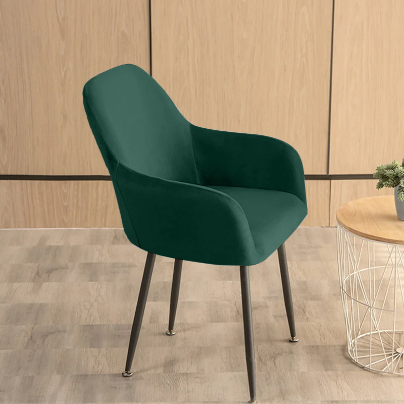 - Pokrowiec na krzesło kubełkowe z podłokietnikami, wykonany z miękkiego weluru w kolorze butelkowej zieleni. Model Apple Sevilla nadaje wnętrzu elegancji i subtelnego ciepła.