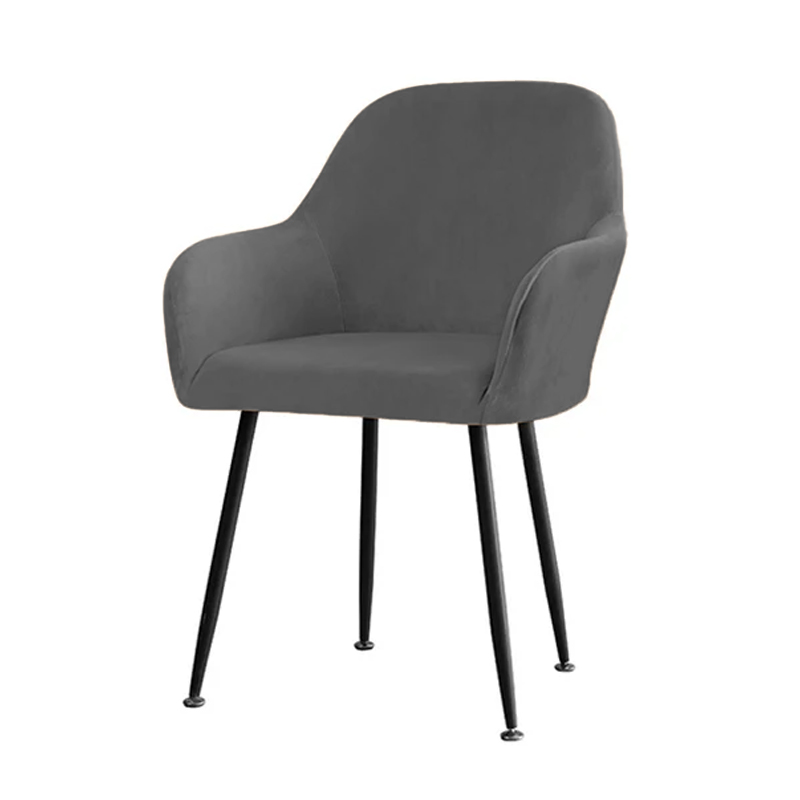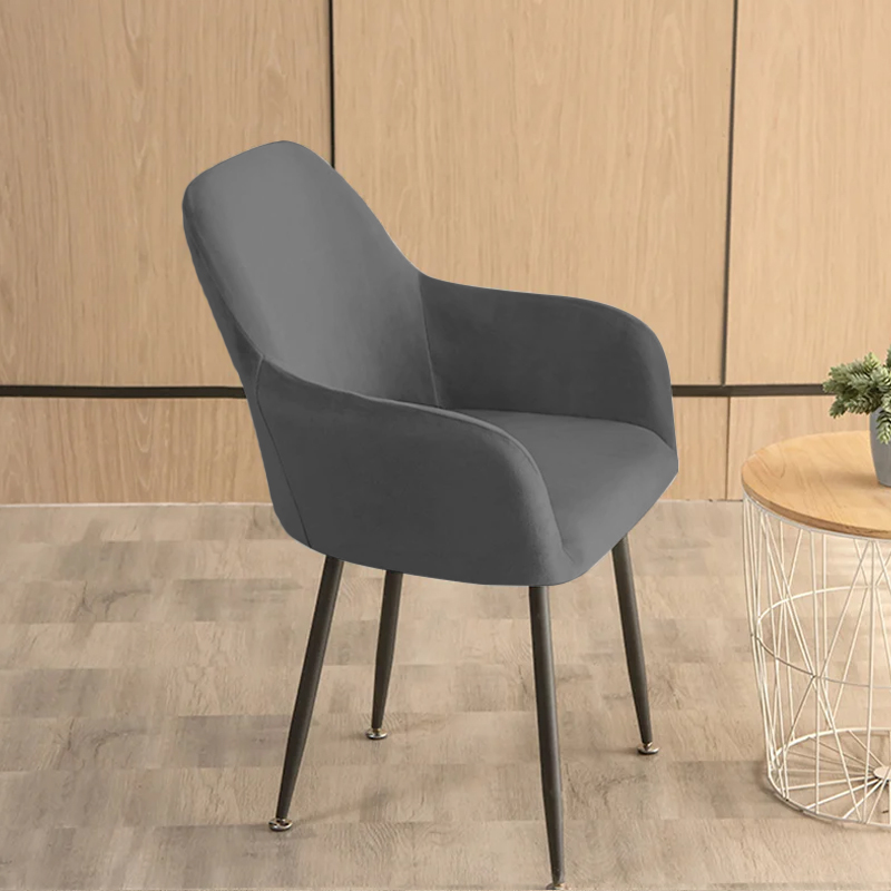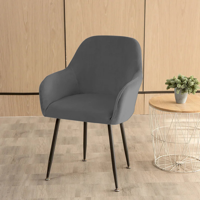 - Pokrowiec na krzesło kubełkowe z podłokietnikami, wykonany z miękkiego weluru w kolorze ciemnym szarym. Model Apple Sevilla nadaje wnętrzu elegancji i subtelnego ciepła.