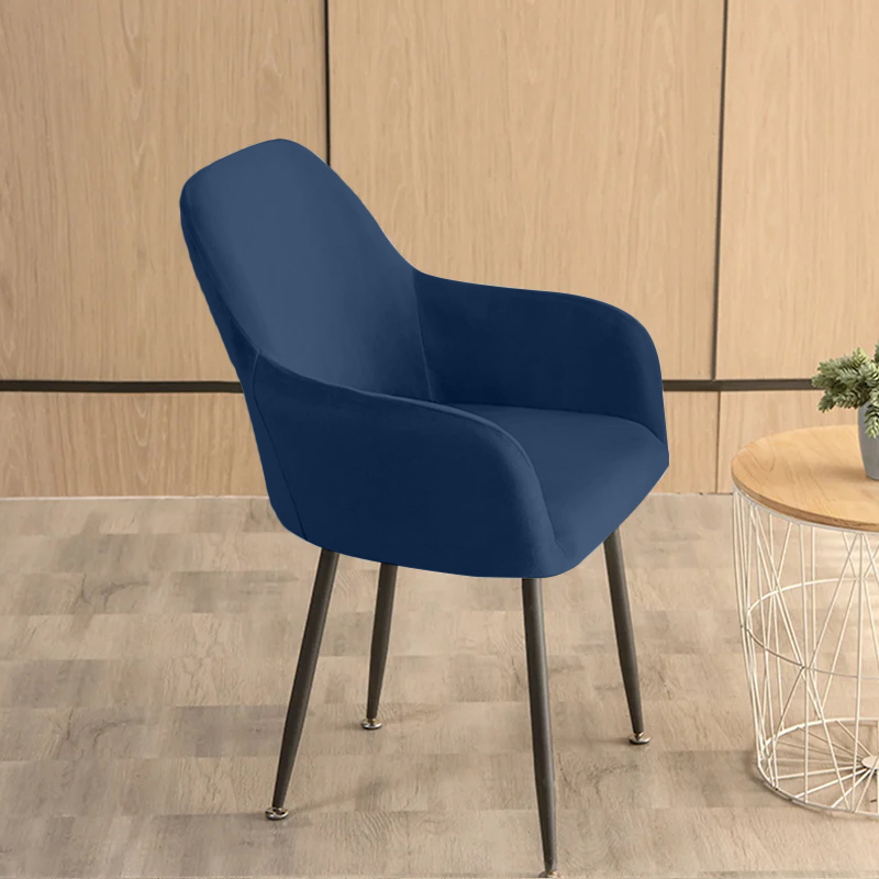 - Pokrowiec na krzesło kubełkowe z podłokietnikami, wykonany z miękkiego weluru w kolorze granatowym. Model Apple Sevilla nadaje wnętrzu elegancji i subtelnego ciepła.