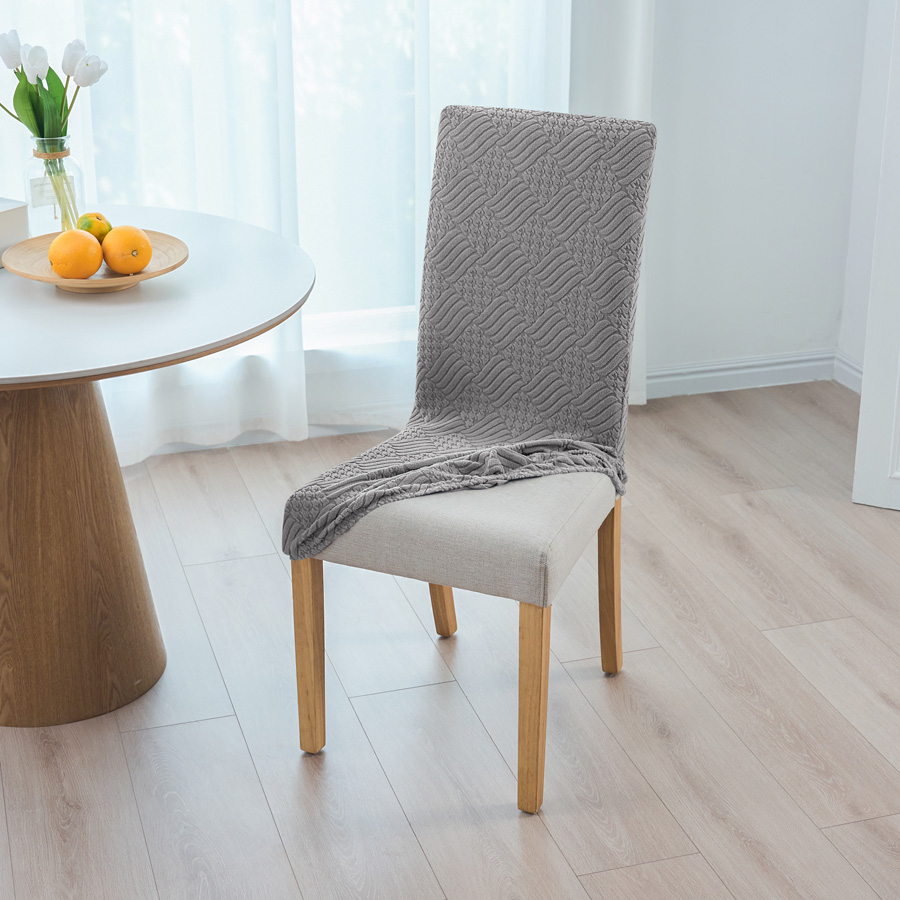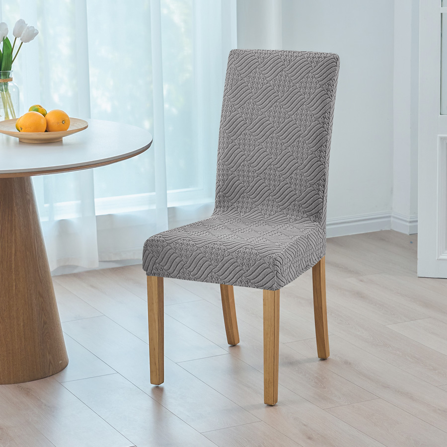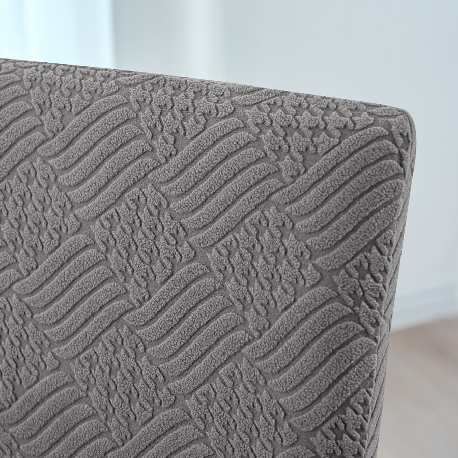 - Pokrowiec na krzesło z grubego żakardu w elegancki wzór wytłaczanych rombów, w kolorze ciemnym szarym. Stylowy i praktyczny dodatek, który odświeży wygląd każdego wnętrza.