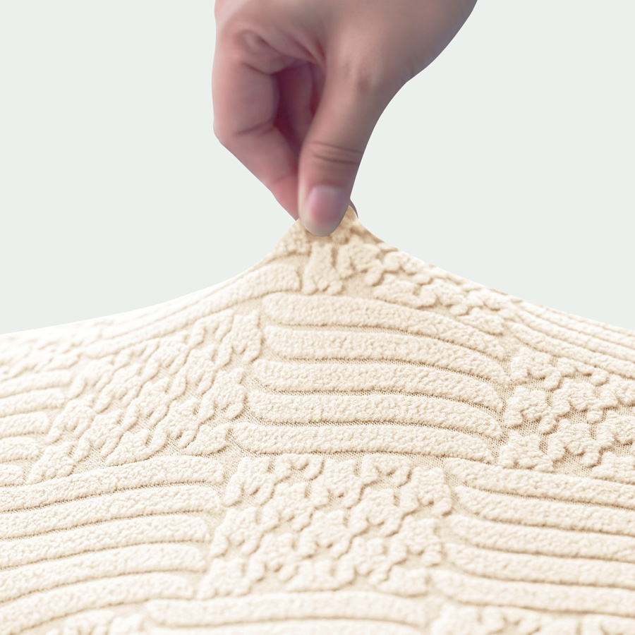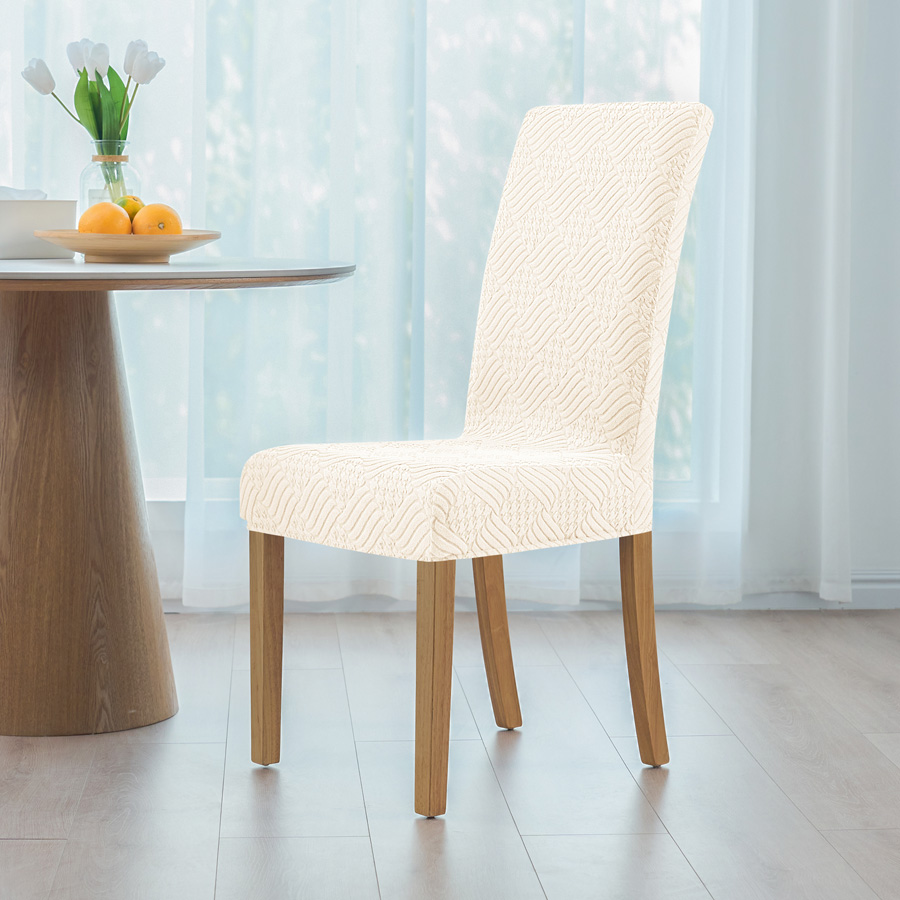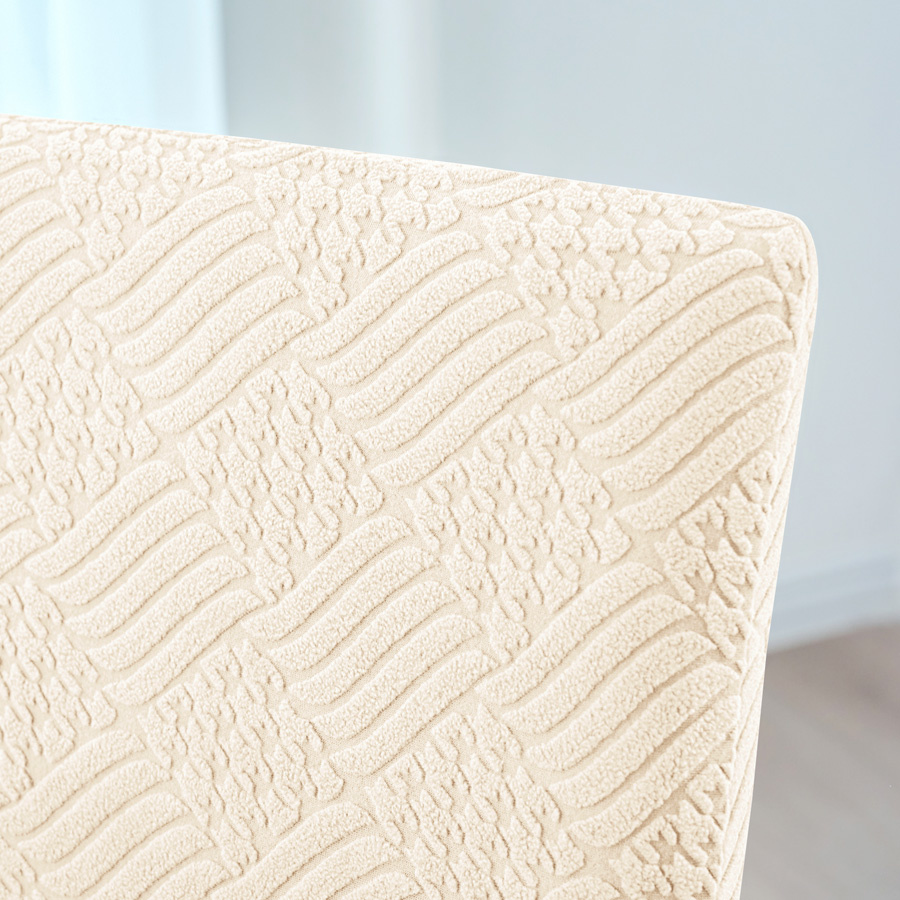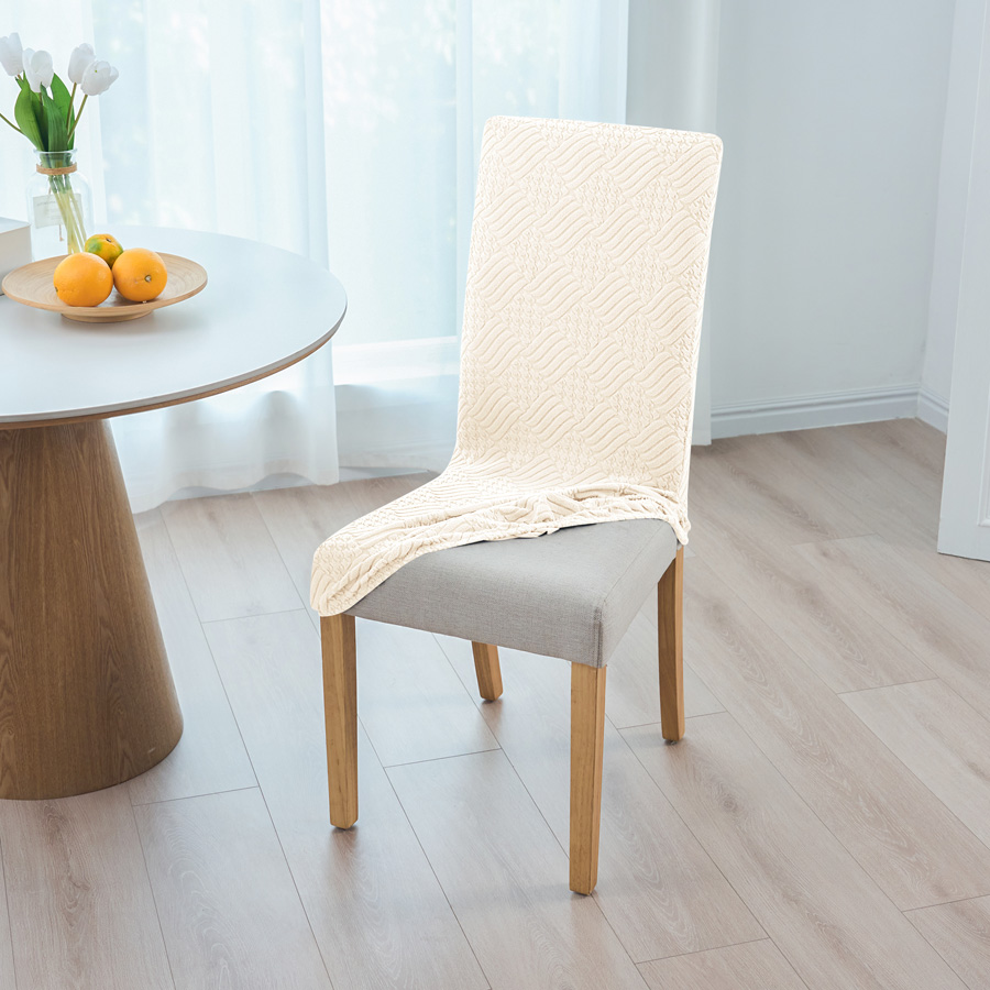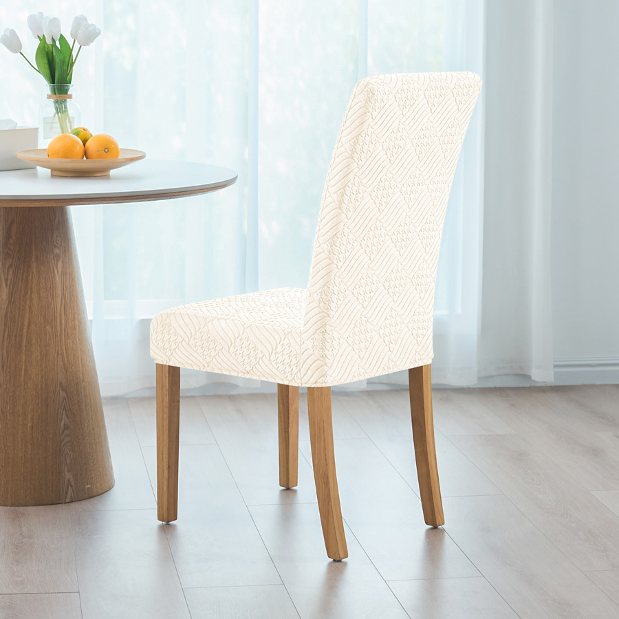 - Pokrowiec na krzesło z grubego żakardu w elegancki wzór wytłaczanych rombów, w kolorze kremowym. Stylowy i praktyczny dodatek, który odświeży wygląd każdego wnętrza.