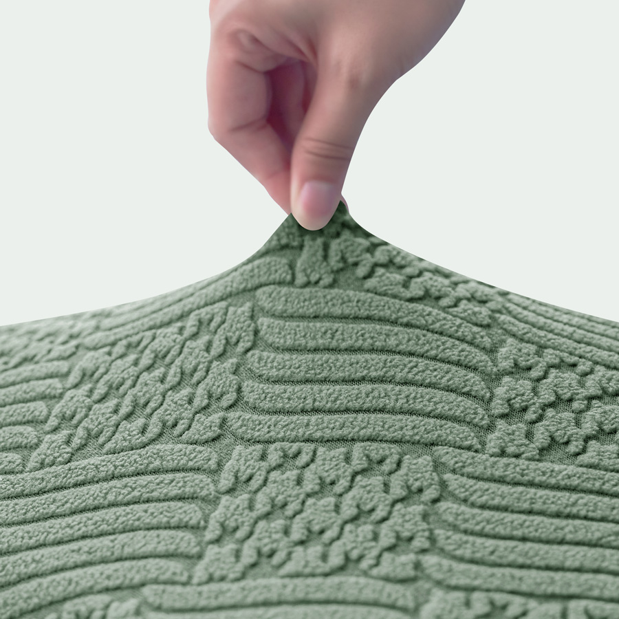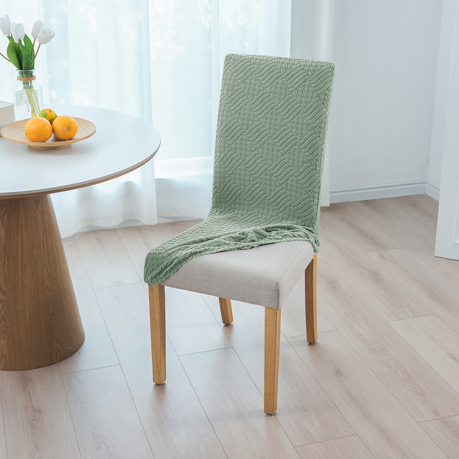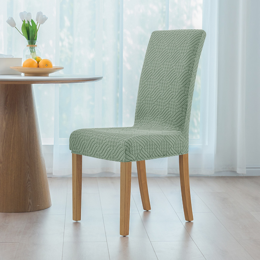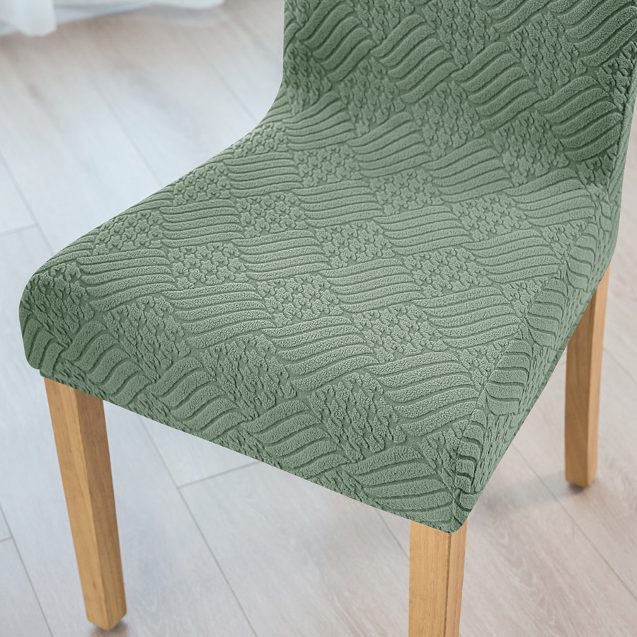 - Pokrowiec na krzesło z grubego żakardu w elegancki wzór wytłaczanych rombów, w kolorze zielonym. Stylowy i praktyczny dodatek, który odświeży wygląd każdego wnętrza.