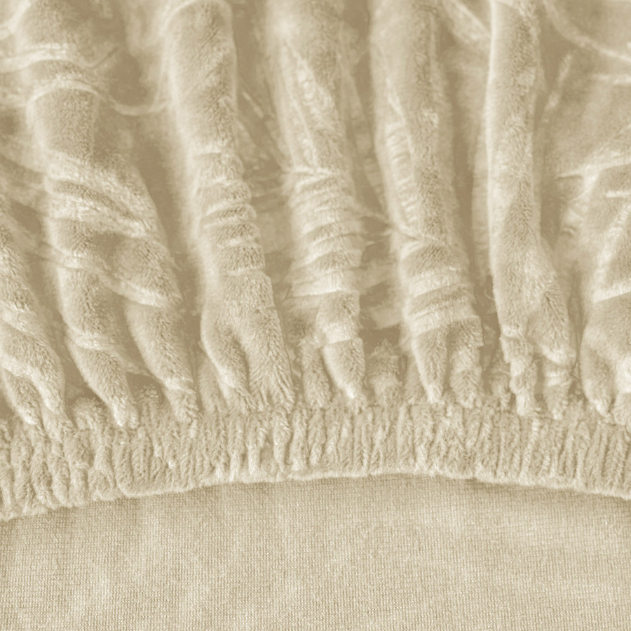 Pokrowiec wykonany jest z miękkiego weluru z wytłaczanym wzorem liści palmowych. Dzięki domieszce elastanu materiał dopasowuje się do mebla i zawsze wraca do pierwotnego kształtu.