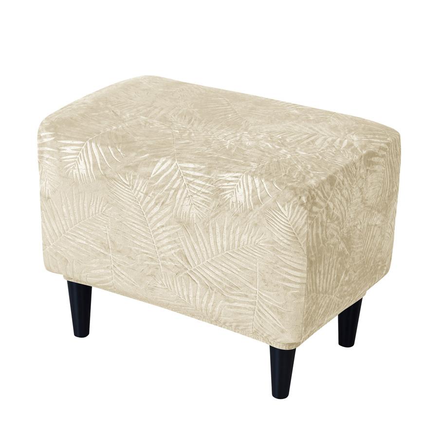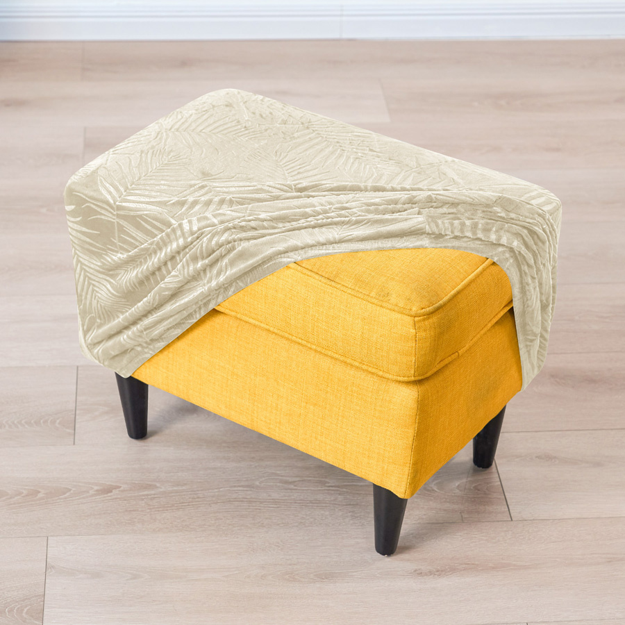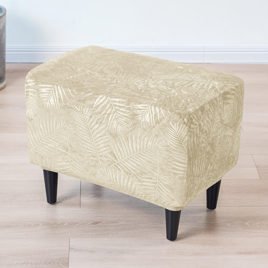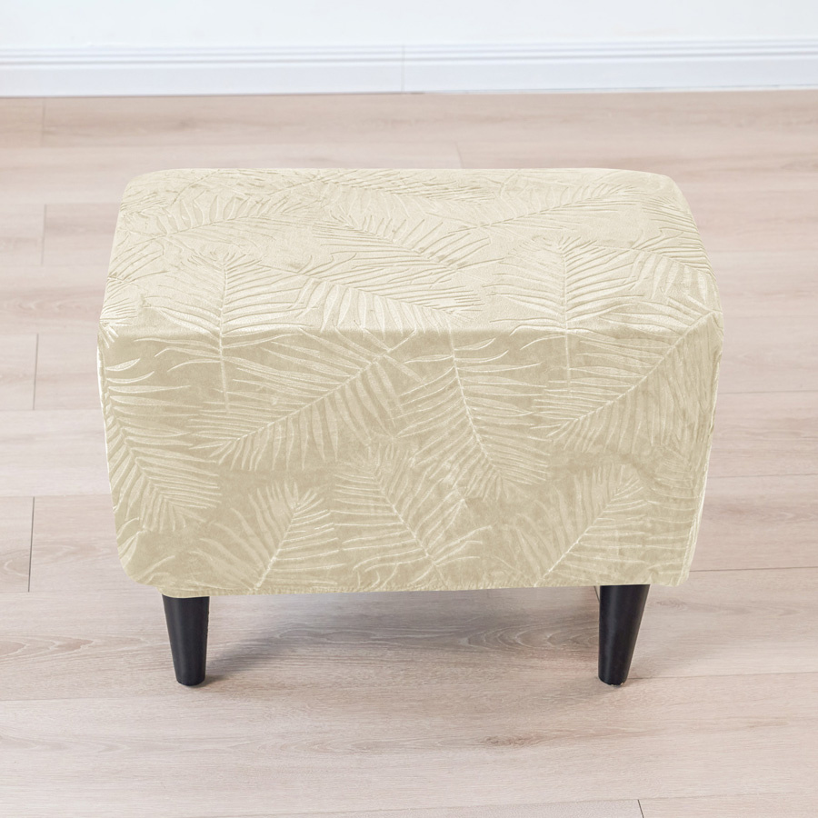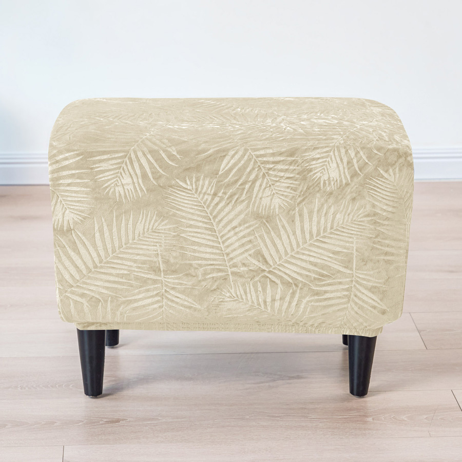 - Welurowy pokrowiec na puf podnóżek z eleganckim, wytłaczanym wzorem liści palmowych w kolorze kremowym. Miękki, przyjemny w dotyku materiał doda szyku i skutecznie ochroni mebel przed zabrudzeniami.
