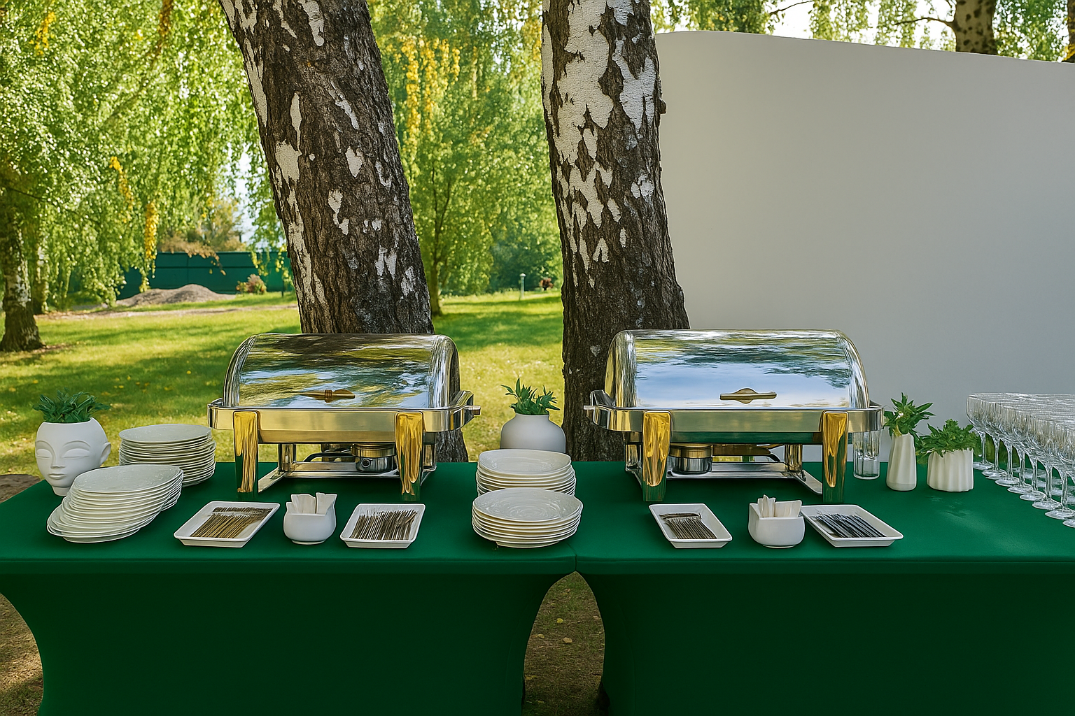 - Pokrowiec w kolorze butelkowej zieleni. Elastyczny, mocny i idealny do sal weselnych, eventów i cateringu.