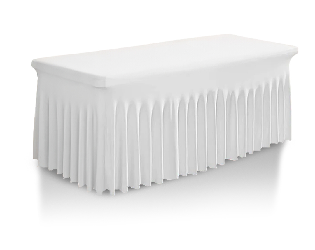 - Elegancki biały pokrowiec z falbaną – idealny na eventy i przyjęcia. Zakrywa całość stołu, tworząc schludne wykończenie.