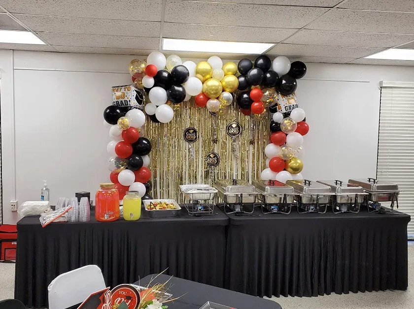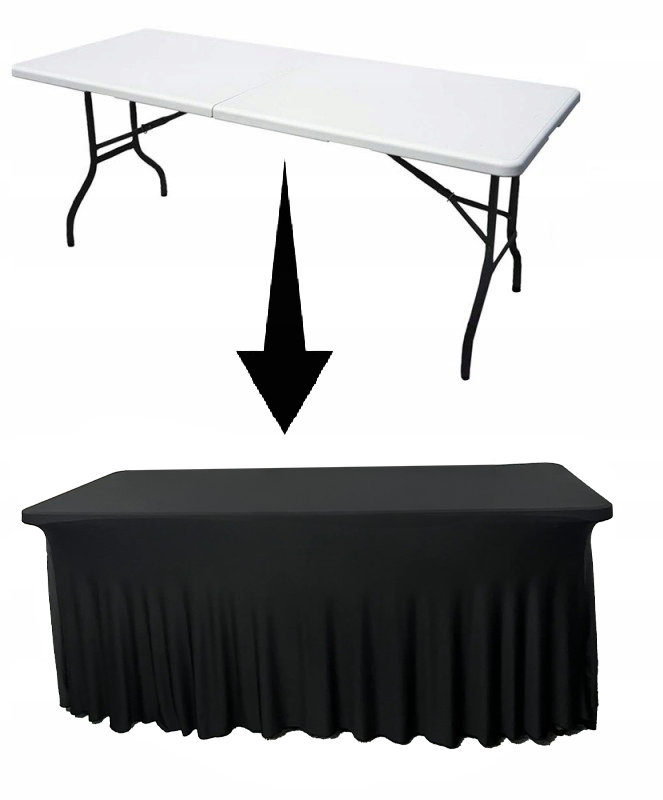 - Stylowy czarny pokrowiec z falbaną – doskonały na eleganckie wydarzenia. Praktyczne i estetyczne rozwiązanie dla stołów cateringowych.