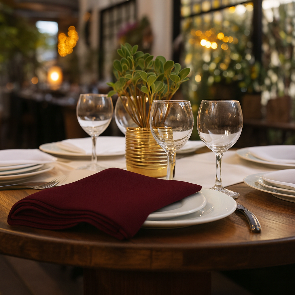 - Eleganckie bordowe serwetki materiałowe to idealne dopełnienie stołu podczas uroczystości, przyjęć i spotkań rodzinnych. Miękkie, trwałe i wielokrotnego użytku — łączą funkcjonalność z klasą.